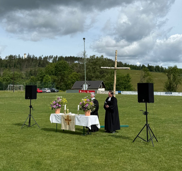Verein| FC-Himmelfahrtsfeier einst und jetzt (29.05.2025) Bereits im Jahr 1965 pilgerten erste Fußballer und Anhänger auf den hochgelegenen und damals recht steinigen Lauensteiner Sportplatz. Der Anlass war nicht etwa ein Fußballspiel sondern der Vatertag, der ausgiebig und ausgelassen gefeiert wurde. Ende der 80er Jahre führte die Kirche an Christi Himmelfahrt einen Feldgottesdienst ein, der meist um 10.30 Uhr dort droben begann. Im Anschluss startete die altgewohnte Feier des FC. Heuer zelebrierten Pfarrer Martin Fleischmann aus Ludwigsstadt und Lektorin Ursula Köster aus Gräfenthal die Messe, umrahmt von unserem Lauensteiner Musikverein. Danach versorgte ein eingespieltes Helferteam des FC die in den letzten Jahren immer zahlreich werdenden Gäste mit verschiedenen Köstlichkeiten. Die Wahl zwischen selbstgebackenen Torten und Kuchen, Käsestangen, Bratwürsten und Steaks der heimischen Metzgerei Stauch fiel nicht leicht, hinzu kamen diverse Getränke. Die Musikkapelle sorgte bei traumhaften Wetter weiterhin für allerbeste Unterhaltung, sodass die Gäste aus Nah und Fern das Fest