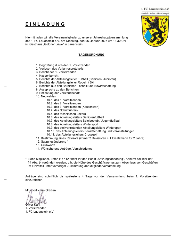 Die Vereinsführung des 1. FC Lauenstein e.V. lädt am Dreikönigstag um 13.30 Uhr zur Jahreshauptversammlung ein. Traditioneller Treffpunktwobei ist hierbei der "Goldne Löwe" in Lauenstein. Die anliegende Tagesordnung enthält insgesamt 14 Punkte, wobei dem Thema "Neuwahlen" sicherlich eine große Aufmerksamkeit gehören wird, Oliver Kahl, 1. Vorsitzender des 1.FC Lauenstein e.V.